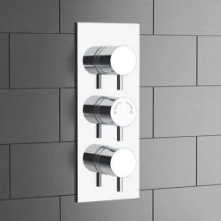The modern Amos triple concealed thermostatic shower valve will compliment any modern bathroom suite with it’s stylish rounded handles, offers thermostatic showering via three easy-to-operate controls. Separate controls for temperature and flow. Operates two outlets separately or simultaneously e.g. Fixed head / Slide rail kit, Fixed head / Body jets or Slide rail kit / Body jets.