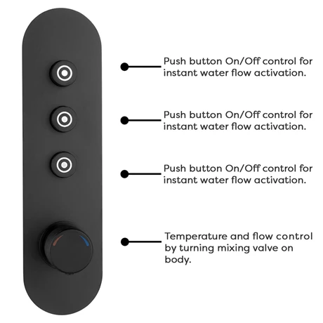 The stylish Arezzo industrial-style matt black 1 touch push button smart control shower valve is perfect for adding a striking finishing touch to your contemporary bathroom. Features easy to use instant 1 touch push button start/stop water flow activation. Temperature and flow is easily adjusted by simply turning the mixing valve. Crafted to the highest standards, this stunning shower valve features a round knurled textured tap head controls, perfect for creating an eye catching industrial look in your bathroom. Plated in a matt black finish which is highly resistant to corrosion. This ‘triple’ shower valve is perfect for installing in a concealed arrangement, outlets that can be operated individually, or enjoy one, two or three simultaneously.
