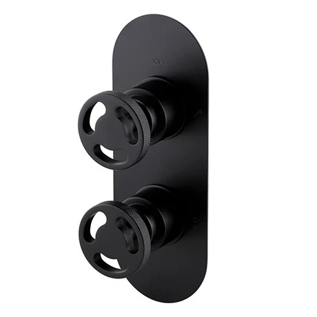 The Arezzo matt black industrial-style concealed thermostatic shower valve with built-in diverter features a stripped-down aesthetic with round knurled textured tap heads, perfect for creating an eye catching industrial look in your bathroom.