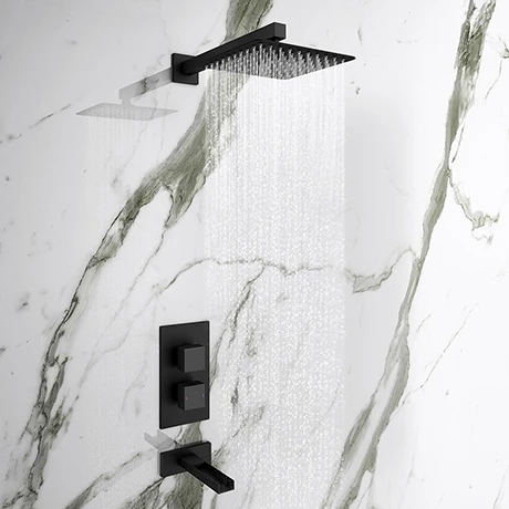 The minimalist matt black Arezzo shower package brings substantial elegance to the modern bathroom range, features a stylish concealed thermostatic valve with diverter which offers thermostatic showering via two easy-to-operate controls for temperature and flow.