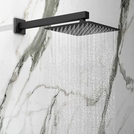 The on-trend Arezzo matt black square minimalist range brings substantial elegance to the modern bathroom. Package includes a concealed triple thermostatic shower valve, fixed shower head and 4 slim square body jets. The shower valve offers thermostatic showering via three easy to operate controls that give you power over temperature and flow. Triple shower valve operates two outlets separately or simultaneously (overhead shower head or body jets). The solid brass construction makes the valve durable and quick to clean thanks to the smooth finish. The ideal solution for multi-option showering.