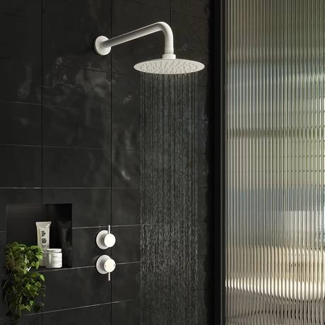 The Arezzo Matt White Concealed Individual Stop Tap and Thermostatic Control Shower Valve Pack features a minimalist round design. This modern shower valve pack is perfect for installing in a concealed arrangement, linked to a fixed shower head.