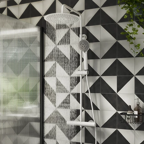 The Arezzo Matt White complete thermostatic shower set offers both the flexibility of a lightweight multi-function spray pattern shower handset and the extravagance of a 300mm fixed round overhead drencher. This premium matt white thermostatic shower comes complete with the newest ceramic disc technology and is easy to install. Featuring matt white shower fixtures in a contemporary round design, it will make a sophisticated centrepiece in your wet room or bathroom. Both shower heads have nozzles than can be rubbed clean to make limescale removal quick and easy.