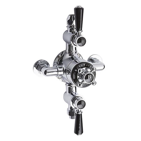 The Bayswater Black Triple Exposed Thermostatic Shower Valve combines the elegance of traditional styling with the precision and technology of modern day design. Manufactured from solid brass and beautifully finished in chrome to the highest quality. The shower valve can be used on all types of water systems and offers full thermal protection to prevent scalding in the event of hot or cold water shut off.