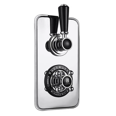 The Bayswater Black Twin Concealed Thermostatic Shower Valve with Diverter combines the elegance of traditional styling with the precision and technology of modern day design. Manufactured from solid brass and beautifully finished in chrome to the highest quality. The shower valve can be used on all types of water systems and offers full thermal protection to prevent scalding in the event of hot or cold water shut off. The built-in diverter allows 2 outlets to be used one at a time.