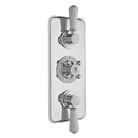 The Bayswater White Triple Concealed Thermostatic Shower Valve with Diverter combines the elegance of traditional styling with the precision and technology of modern day design. Manufactured from solid brass and beautifully finished in chrome to the highest quality. The shower valve can be used on all types of water systems and offers full thermal protection to prevent scalding in the event of hot or cold water shut off. The built-in diverter allows 2 outlets to run separately or simultaneously and diverts to a third.