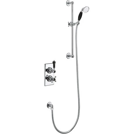 The Trent Black Thermostatic Concealed Single Outlet Shower Valve with Slide Rail, Hose & Handset epitomises elegance with its traditional design. This shower package comprises of a thermostatic single function brass valve with independent temperature control, traditional brass faceplate, Claremont handle with ceramic lever, slide rail including the elbow, hose and handset with ceramic handle. All ceramic parts are made of a unique subtle off-white, natural coloured ceramic, reminiscent of bygone eras of great bathroom design.