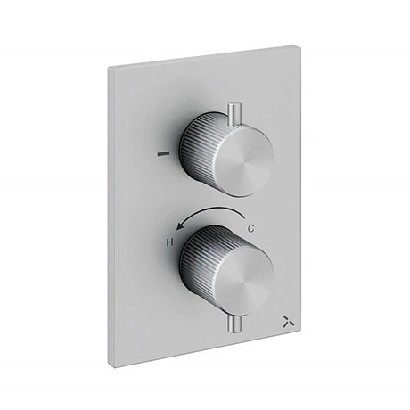 Two Outlet CROSSBOX delivers water to two water outlets, where you can divert between the two or have both outlets on at the same time. If you want a quicker and easier way to install a shower valve that projects less, choose CROSSBOX. This trim set includes flow control, thermostat, backplate and handles.