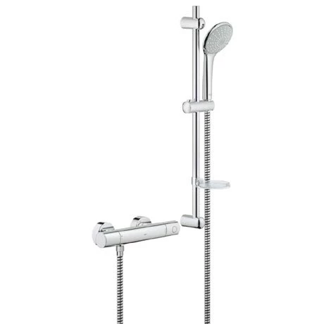 The Grohtherm 1000 Cosmopolitan Thermostatic Shower Mixer and Kit is perfect for the family bathroom. The SafeStop button prevents the temperature from being turned up too high and can be easily adjusted for personal preferences. The StarLight® chrome finish makes it easy to clean and is scratch resistant. Includes shower kit consisting of a 600mm shower rail, 1500mm shower hose and a 1 spray pattern handset.