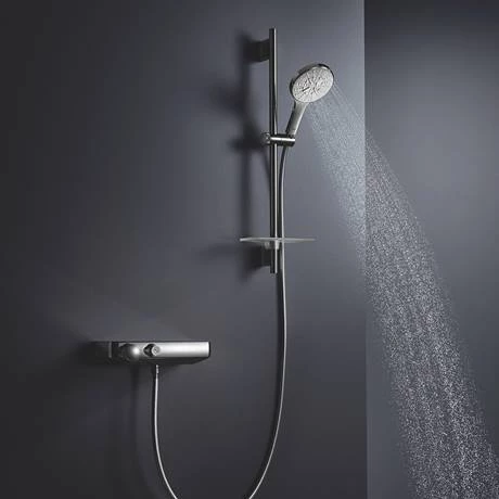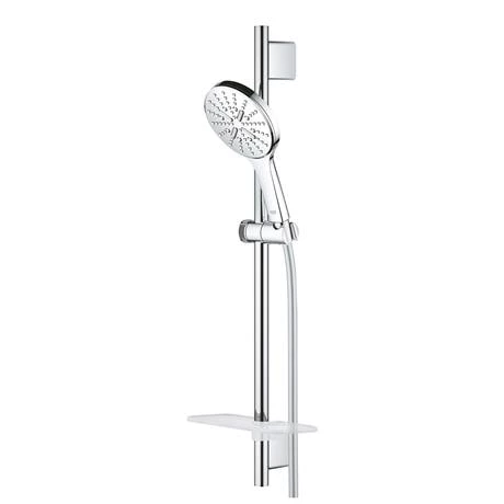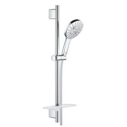 Why not give your shower an instant upgrade with the sleek and stylish GROHE Rainshower 130 SmartActive hand shower, which delivers modern design and performance. It comes with a 1750mm TwistFree Silverflex shower hose, 600mm matching rail and a GROHE EasyReach tray to organize your shower space. It is also packed with innovative technology. GROHE SmartTip โ an ergonomic controller on the rear of the handle โ gives you fingertip control of the spray pattern: pulsating GROHE ActiveMassage spray, which delivers a whole new level of revitalising massage power, invigorating Jet Spray and Rain Spray โ as gentle as warm summer rain. When you turn the water off GROHE DripStop minimizes annoying drips from Rain and Jet spray. Thanks to GROHE DreamSpray, the flow from every nozzle has a perfectly balanced flow for maximum satisfaction, and the silicone anti-lime SpeedClean nozzles are extra easy to clean too. It also has GROHE EcoJoy, which limits water flow to 9.5 l/min but also delivers pure indulgence, and with a durable GROHE StarLight chrome finish it looks pristine for years. The Inner WaterGuide prevents the surface from getting too hot, protecting both your skin, and the sparkling chrome. Installation is incredibly easy too โ the GROHE QuickFix Plus system ensures you can use existing holes while GROHE TileFix gives you the flexibility to alter the depth of each bracket to create a perfect fit, ideal for partially tiled bathrooms.