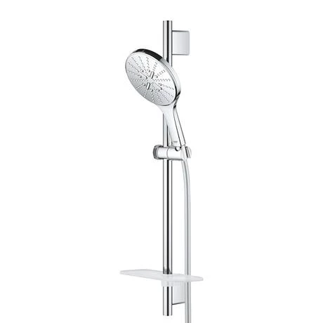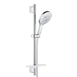 The Grohe Rainshower SmartActive 150 3 Spray Shower Slider Rail Kit fuses cutting edge technology and minimalist design. It comes with a TwistFree Silverflex shower hose, 600mm matching rail and a GROHE EasyReach tray to organize your shower space. GROHE SmartTip – an ergonomic controller on the rear of the handle – gives you fingertip control of the spray pattern: pulsating GROHE ActiveMassage spray, which delivers a whole new level of revitalising massage power, invigorating Jet Spray and Rain Spray – as gentle as warm summer rain.