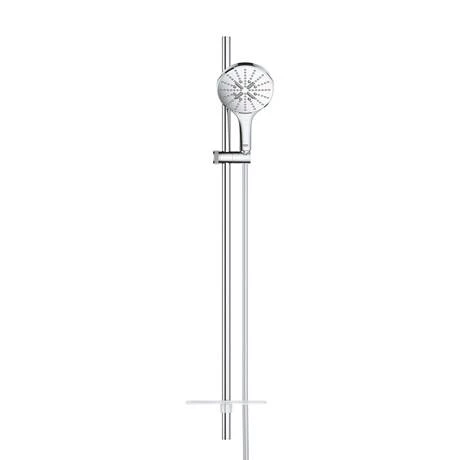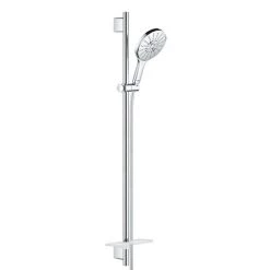 The Grohe Rainshower SmartActive 150 3 Spray Shower Slider Rail Kit fuses cutting edge technology and minimalist design. It comes with a TwistFree Silverflex shower hose, 900mm matching rail and a GROHE EasyReach tray to organize your shower space. GROHE SmartTip – an ergonomic controller on the rear of the handle – gives you fingertip control of the spray pattern: pulsating GROHE ActiveMassage spray, which delivers a whole new level of revitalising massage power, invigorating Jet Spray and Rain Spray – as gentle as warm summer rain.