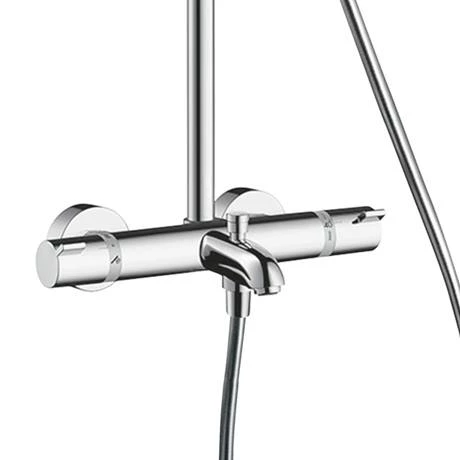 The Croma Select S Showerpipe 180 Thermostatic Bath Shower Mixer combines a hand and overhead shower with a bath filler into one product. It features a swivelling 180mm shower head and shower handset with a height-adjustable shower holder that can also be turned and tilted. The self-locking slider can be operated with one hand. The head shower has two revitalising spray patterns while the hand shower features a Select button to comfortably switch between the three spray modes. The QuickClean rub clean nubs loosens any limescale deposits making sure your hand shower looks beautiful, and stays working for longer. The easy to use diverter switches effortlessly between the head shower, handset or bath spout.