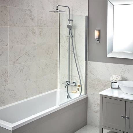 The Vernis Shape Showerpipe 230 Thermostatic Bath Shower Mixer combines a hand and overhead shower with a bath filler into one product. It features a swivelling 205mm shower head and shower handset with a height-adjustable shower holder that can also be turned and tilted. The self-locking slider can be operated with one hand. The QuickClean rub clean nubs loosens any limescale deposits making sure your hand shower looks beautiful, and stays working for longer. The easy to use diverter switches effortlessly between the head shower, handset or bath spout.