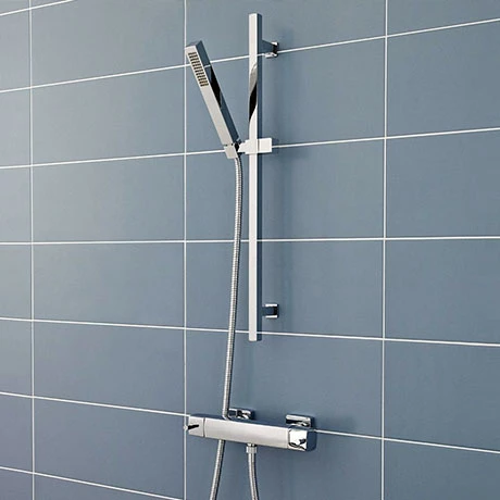 The Quadro exposed thermostatically controlled bar valve with bottom outlet, constructed from solid brass with a chrome finish. The handle on the left controls the water flow, whilst the handle on the right controls the temperature. Thermostatic showers prevent a fluctuation in temperature whilst the shower is running – prevents the risk of scalding, or sudden cold spells! Give your bathroom a makeover with this Hudson Reed Quadro Thermostatic Bar Valve and Kubix Slide Rail Kit.