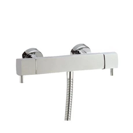 The Quadro exposed thermostatically controlled bar valve with bottom outlet, constructed from solid brass with a chrome finish. The handle on the left controls the water flow, whilst the handle on the right controls the temperature. Thermostatic showers prevent a fluctuation in temperature whilst the shower is running – prevents the risk of scalding, or sudden cold spells!