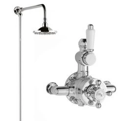 Hudson Reed Traditional Twin exposed 3/4 inch thermostatic valve with 6″ diameter rigid riser kit and shower rose. The turn of the century evokes a feeling of greatness, an era when engineeing was the world’s driving force, and this sense of achievement is replicated in our collection of traditional styled showers. Suitable for all types of plumbing installation this shower valve has the added safety benefit of a built in anti scald device should the cold water supply fail.