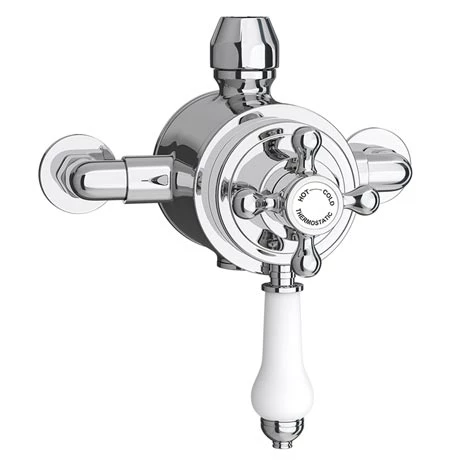 The classic body of this Trafalgar Traditional Dual Exposed Thermostatic Shower Valve will add a touch of sleek sophistication to your bathroom or en-suite. The valve is designed for use with a slider rail or rigid riser kit and is suitable for modern plumbing systems. Manufactured from durable brass, this dual exposed shower valve boasts a polished chrome finish and a decorative white lever that controls flow. There’s even an easy to operate cross head handle to manage water temperature – its handy built in anti scald technology is a practical feature that keeps you safe.