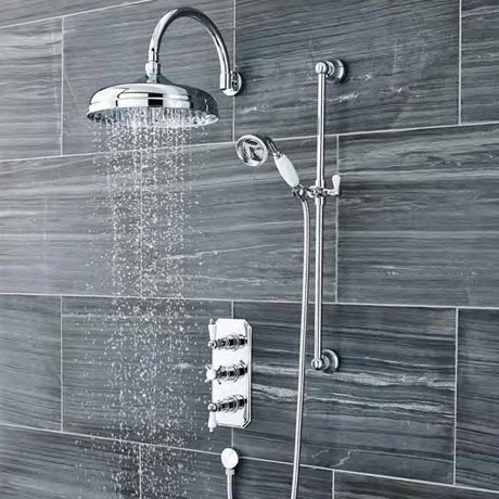 The Traditional Triple Concealed Thermostatic Shower with stylish slide rail kit and fixed head from Ultra is part of our luxury period collection of chrome plated brass bathroom products.